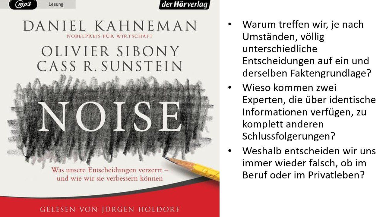 Daniel Kahneman, Wirtschafts-Nobelpreisträger und weltweit renommierter Ökonom und Psychologe, beschreibt in seinem Buch die Variabilität von Entscheidungen, die von einer Vielzahl von oft zufälligen Faktoren gestört werden. Zudem beschreibt er Methoden, wie mit Noise in der Entscheidungsfindung umzugehen ist und wie Noise letzten Endes reduziert werden kann.